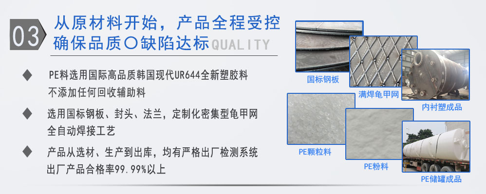 公司有鋼襯塑PE/PO、PE全塑、碳鋼、不銹鋼四大系列100多個(gè)品種,專(zhuān)注于常壓儲(chǔ)存容器生產(chǎn),其產(chǎn)品包括鋼襯塑儲(chǔ)罐、管口一體成型PE儲(chǔ)罐、碳鋼儲(chǔ)罐、不銹鋼儲(chǔ)罐、反應(yīng)釜、攪拌罐、離子交換柱、鋼襯PE/PO儲(chǔ)罐、塑料儲(chǔ)罐、鹽酸儲(chǔ)罐、硫酸儲(chǔ)罐等等。更大限度滿足廣大客戶(hù)的各種需求,同時(shí)可以根據(jù)客戶(hù)的需要加工定制各種防腐設(shè)備。